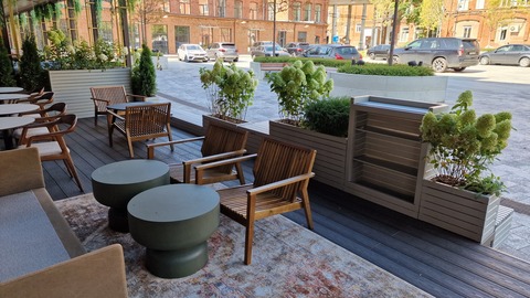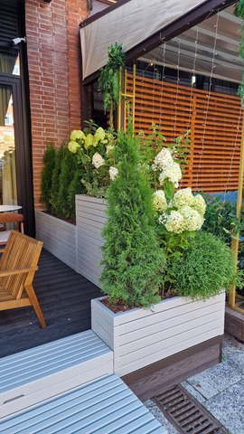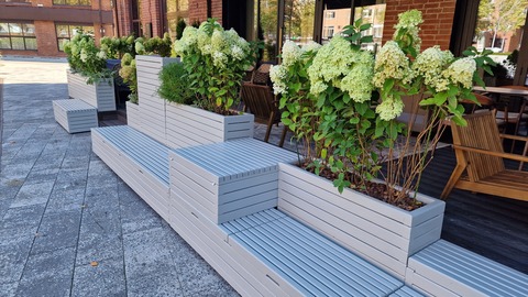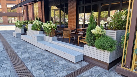 Какие элементы можно включить: стейшен для хостес, стойки для меню, скамейки с открывающимися отсеками, кашпо, ящики для хранения уличного инвентаря, а также столы и стулья.